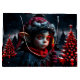 Gothic elf magic under the full moon. In the silent, snowy night, where the moon casts its silver light over the glittering landscape, stands a young Gothic elf, his pointed ears bobbing slightly in the gentle wind. His large, red eyes shine like ruby-red stars and seem to hold the secret of the night. In his hand he holds a burning candle, the flame of which is warm and lively, a small point of light in the frosty darkness.