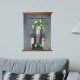 This tapestry with wood hangers has a Gothic looking girl in a bright green hat, purple and black dress with tattoos and fingerless gloves on a dark grey background.