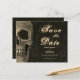 Gothic half skull vintage sepia budget Save The Date flat card invitation. Fun, spooky Halloween Till Death Do Us Part script on texture print background on back. Image copyright Marg Seregelyi Photography.