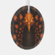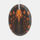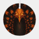 This round ornament showcases a haunting peacock-like creature with a skeletal bird skull head, glowing ember-orange eyes, and an explosive display of flame-tipped feathers. The deep blacks and molten oranges create a dramatic, smoldering effect that feels powerful, mysterious, and impossible to ignore.