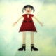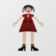 This awesome shaped window cling features a digital art image of a creepy but beautiful Halloween Vampiress. The female vampire has long spiky black hair and is wearing a red dress adorned with a spider and decorated with black skulls, stars, diamonds and pair of black swans. She has bright red lips covered in lipstick and a sultry smile and long white fangs. She also has black fingernails, a blood red bracelet of rubies and black high heel boots with gold bows on them. Her arms are open welcoming you for an evil embrace.