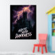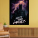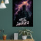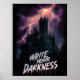 A dramatic, vertical graphic featuring a towering, silhouetted gothic castle or mansion under a furious thunderstorm. Intense orange and purple lightning cracks across the dark sky, highlighting the imposing structure. The text "WRITE YOUR DARKNESS" is prominently displayed in a bold, dripping, horror-style font.
