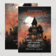 A bold Halloween invitation featuring a gothic haunted mansion under a blood-red sky—perfect for setting a thrilling party mood.