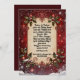 This stunning holiday party invitation has sprigs of holly surrounding an ornate, Gothic frame on a dark red background.