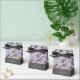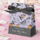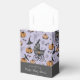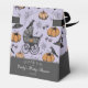 Personalised "Thank You" Halloween/Fall Baby Shower favour box, featuring hand-drawn baby carriages, black crows, witch hats, pumpkins, spiderwebs and tiny mushrooms against an elegant light purple background. Printed on both front and back. Simply click on "Personalise this template" to insert your own Event and Date.