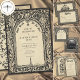 Embrace a dark romantic aesthetic with this gothic ornate parchment vintage details enclosure card design. Featuring an antique parchment background and intricate black scrollwork, it's perfect for a dramatic evening ceremony. This bold look offers a timeless, Victorian feel for your unique day. Created by Simply Farmhouse Press.