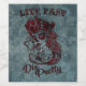 Live fast die pretty gothic sugar skull pirate woman with a rose tattoo in jewel textured red set on a blue grey pattern background.