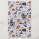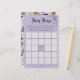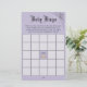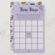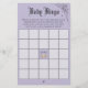 This Halloween Baby Shower game is called "Baby Bingo". The design: On the front, a BINGO game card with instructions. On the back, a hand-drawn pattern in black ink featuring Victorian baby carriages, black crows, spiderwebs, pumpkins and tiny mushrooms, all against an elegant soft purple background.