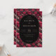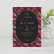 This wedding invitation features a striking gothic-romantic theme with an intricate floral and skull pattern set against a black backdrop. The design showcases deep reds, muted pinks, and dark greys, creating a macabre yet elegant atmosphere. An oval frame centres the text, which is presented in a formal serif font, enhancing the traditional wedding vibe while adding a unique edgy twist. Perfect for couples seeking a memorable and distinctive look, this invitation blends beauty with morbidity to celebrate their special day.