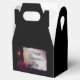 Valentines day favour box with a gothic look. An old greying parchment paper with hints of purple-red around the edges, Happy Valentine's Day written inside. A magenta rose in full bloom, a rosebud, and candle on a dark burgundy background creates a beautiful, dark and mysterious gothic design.