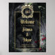This black and gold gothic wedding welcome sign, featuring a gothic ruins roses floral scene, can be personalized with your monogram initials and event information in stylish typography. Designed by Thisisnotme©