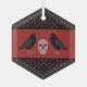 This ornament features a graphic image of a skull with red eyes and yellow teeth covered in cracks. The creepy skull has a large raven standing either side of it like a guardian. The ravens are black with grey legs and claws. They also have beady black eyes.