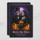 This romantic gothic wedding save the date announcement flat card features a skull candy skeleton couple dressed in wedding attire with candles and orange flowers with your names and wedding date . The back of the card reads "Till Death Do Us Part". Images generated with AI.