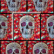 Colorful gothic skull pattern with black border. Cool craft sewing material. Trendy, modern, red green psychedelic fabric. Abstract popart culture. Image copyright Marg Seregelyi Photography.