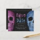 Gothic skull head budget Save The Date. Fun pink, blue, black vintage style Halloween wedding invitation flat card. Spooky Hallowedding. Till Death Do Us Part typography. Image copyright Marg Seregelyi Photography.