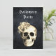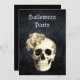 This stylish Halloween invitation is perfect for your Gothic Themed Halloween party. Design features gothic floral skull on a black textured background. The skull is accented with beautiful white roses. The back of the invitation has all the details of the party that you can easily customise.
