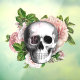 This whimsical Halloween design features an anatomy drawing of a skull with pink roses.