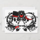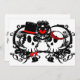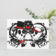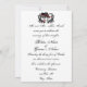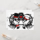 The bride is a white skull, with black vines, decorations and blood red headband. The groom is a white skull, with black vines, decorations and blood red tie and hat band. A blood red heart in a black wreath bond the couple for eternity. A skulls goth themed wedding invitation
