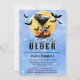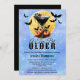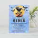 Gothic Spooky A Tini Bit Older Birthday Party Invitation - Featuring a black drink in a martini glass adorned with skulls and orange pumpkins. Black bats fly around and a full yellow eerie moon is in the background. A blue and purple starry, mystical and celestial sky is the backdrop for this goth, witchy vibes birthday invite. All text is editable. Available as an instant digital download, perfect for sending via text, email or social media.