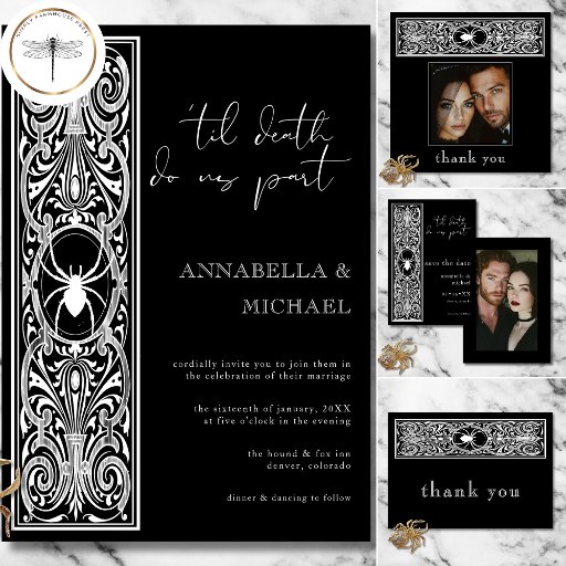 Celebrate your eternal love with a wedding invitation as bold and unforgettable as your bond. Featuring a dramatic black background, an elegant gothic white border, and a delicate spider motif, this design sets the tone for a night of romance and mystery. The striking white font declares, "Until Death Do Us Part," capturing the essence of your forever vow. Perfect for couples who dare to embrace the beauty of the dark and the depth of true commitment. Created by Simply Farmhouse Press.