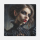 This magnet features a spooky but beautiful vampire woman with red eyes, blood-red lips, and sharp fang. She is dressed in black Victorian fashion, embodying the perfect mix of gothic romance, dark fantasy art, and haunting horror aesthetics.