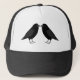 This awesome hat features a digital art image of a pair of beautiful black ravens facing each other and looking like they are kissing. They are black with beady eyes and grey beaks and feet.