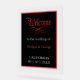 Welcome Sign – Red Metallic Script on Transparent Acrylic