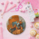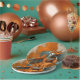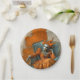 A great choice for your upscale Halloween Costume Party with a theatrical slant, this hauntingly elegant paper plate design has a gothic woman at the opera, posed in her chair with one hand on her cheek and the other outstretched. Her ball flowing orange ball gown is elegant with her spider web opera gloves, porcelain painted face with heavy dark eye makeup and clown-like hat all in Phantom style. An abstract painted background in orange, beige and taupe add artistic flair to the look.