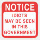 NOTICE IDIOTS MAY BE SEEN IN THIS GOVERNMENT. - A funny political sign stating the obvious. Stick it on your books or bag! Or send it to the government of your choice! Order your fun political sticker now!