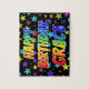 This fun, exciting, birthday-themed jigsaw puzzle design has the message "HAPPY BIRTHDAY, GRACE" with the characters having a colorful rainbow spectrum inspired gradient pattern, in addition to a vibrant stars background pattern. An exciting puzzle like this might be used to send birthday wishes to somebody named Grace. [~Z0000468]