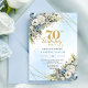 Celebrate a milestone in style with this elegant 70th birthday invitation featuring watercolor dusty blue and white flowers, soft eucalyptus greenery, and a shimmering gold frame. Designed in chic boho style with refined script lettering, this floral invitation is perfect for a classy 70th birthday party. Ideal for formal, garden, or luxury celebrations with a timeless, sophisticated touch.