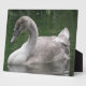 This awesome plaque features a photograph of a beautiful swan. The swan is a juvenile bird, you can tell by the grey feathers on the head and the lack of an orange beak. The swan is gliding gracefully across the water on a calm lake.