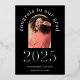 Grad 2025 Arch Photo Black Real Gold Foil Announcement. A modern style to announce the news of your graduate with 2025 in real foil in silver alongside the rest of the text in white on a classic black background. Easily to personalise with your grad’s name and high school and message on the back, and replace the sample photo with your own which is within an arch shape