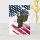 Bald eagle with a white graduation diploma in talons on contemporary abstract flag design.