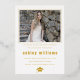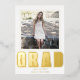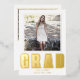 Introducing a contemporary and sophisticated graduation announcement for the Class of 2025, adorned with a touch of opulence through the use of modern and elegant gold foil. This exquisite design showcases the prominent "GRAD" inscription in shimmering gold foil, beautifully complemented by the graduate's captivating photo set against a pristine white background. Turning to the back, an additional photo graces the announcement, while also providing a platform to include all the essential details of this momentous graduation celebration.