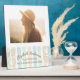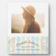 Grad club beach party with cabana stripes in shades of mint green, coastal blue and sandy brown with seashells. Photo template via Pixabay licensed under CC0 and must be replaced with your own photo.