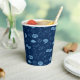 Celebrate a graduation with this festive navy blue paper cup featuring caps, stars, and congratulatory phrases.