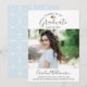 Celebrate your Grad with this graduation announcement featuring his/her photo, script lettering and a faux gold grad cap on the front and a geometric pattern on the back. Current backside color is set to blue but easily change the color - just click on customize and then scroll down to the color picker. Trendy and stylish yet simple and classic, the perfect graduation announcement to celebrate your grad's achievements.
