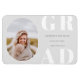 Rounded photo frame, senior class graduation announcement magnet. Soft silver grey background, white bold type "GRAD" and coordinating grey text template lines for graduate's name, class of year and school.