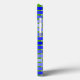 This phone case has a geometric design of lines in shades of blue and green woven to make a plaid.
