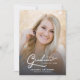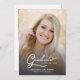 Simple modern script with two photos Graduation Announcement. Featuring a full size photo on the front with white text overlay and a photo on the reverse side with optional details.