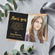 An elegant and modern photo graduation thank you card for her. Black coloured backdrop. With the text: Thank You! written in a hand lettered style script, faux gold letters. Templates for your photo of the graduate, thank you note and name, golden letters.