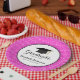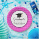 This graduation paper (disposable) plate features a graphic of a graduation hat (mortarboard) and custom text to personalise with the name of the graduate. The design is accented with a white swirl pattern on a bright pink background.