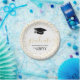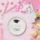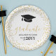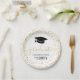 These stylish black, white and gold graduation party paper plates have the word “graduate” in modern calligraphy script font, with the name of the graduate and the class of year, and a grad cap at the top. There is a frame of faux gold glitter confetti around the edge.