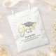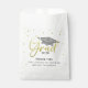 This design features a graduation grad party favour bag, graduation cap mortar board gold, high school or college senior, custom personalised name class of, a trendy stylish calligraphy script font, graduation grad party supplies, simplistic contemporary modern design, treat cookie bar dessert gift, doggie bag to go dessert, graduation party treat bag