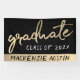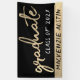 Trendy graduation party template overlay with accents in a sophisticated black and faux metallic champagne gold palette. The design features a chic hand-lettered sepia gold brush script “graduate” typography on a black background along with the grad’s name and graduation year. Great way to honour your elementary middle school, high school, or college grad! #Classof2019 #bound