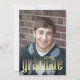 This design features a graduate gold black graduation, with grad party class of year, with simple modern minimalist minimal, a stylish trendy block typography font, with two 2 photo layout template, for high school or college senior, with QR code website social media, with photo vellum text font overlay, with clean simplistic modern design, a gold and black gradient effect