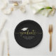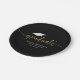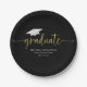 This design features a graduate grad modern simple party, with a graduation gold mortarboard cap mortar board hat with tassel, for high school or college seniors, a custom personalised name class of your year, a trendy stylish basic black block font, a grad party paper plate tableware, graduation grad party supplies, a simple minimalist gold confetti party, a simplistic contemporary modern design, a grad graduation dinner dessert plate