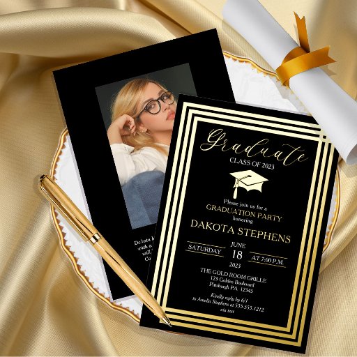 Celebrate your graduate in bold, modern style with this real gold foil on a green background graduation party with photo and plans / details design. Features a front triple stair-stepped rectangular geometric frame to frame your party details. Design also includes a foil graduation cap and "Graduate" (uneditable) script text. Composite design by Holiday Hearts Designs ( rights reserved). Placeholder template photo courtesy Unsplash.
