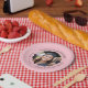 Graduation paper plates featuring your photo inside a wavy frame border and your custom text around the photo. Black text on pinke or custom colour background.